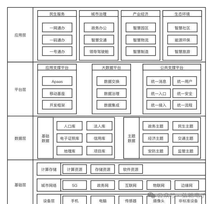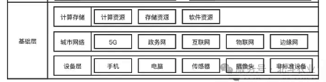 基礎(chǔ)層包括:設(shè)備層、城市網(wǎng)絡(luò)、計(jì)算存儲(chǔ)共同組建而成。