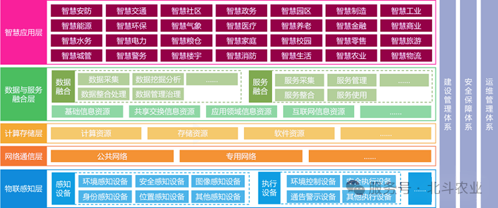智慧城市的網(wǎng)絡(luò)通訊技術(shù)(ICT)架構(gòu)自下而上包含五層,依次為:物聯(lián)感知層、網(wǎng)絡(luò)通信層、計(jì)算存儲(chǔ)層、數(shù)據(jù)與服務(wù)融合層、智慧應(yīng)用層,除基礎(chǔ)架構(gòu)外,還包含建設(shè)管理體系、安全保障體系和運(yùn)維管理體系。
