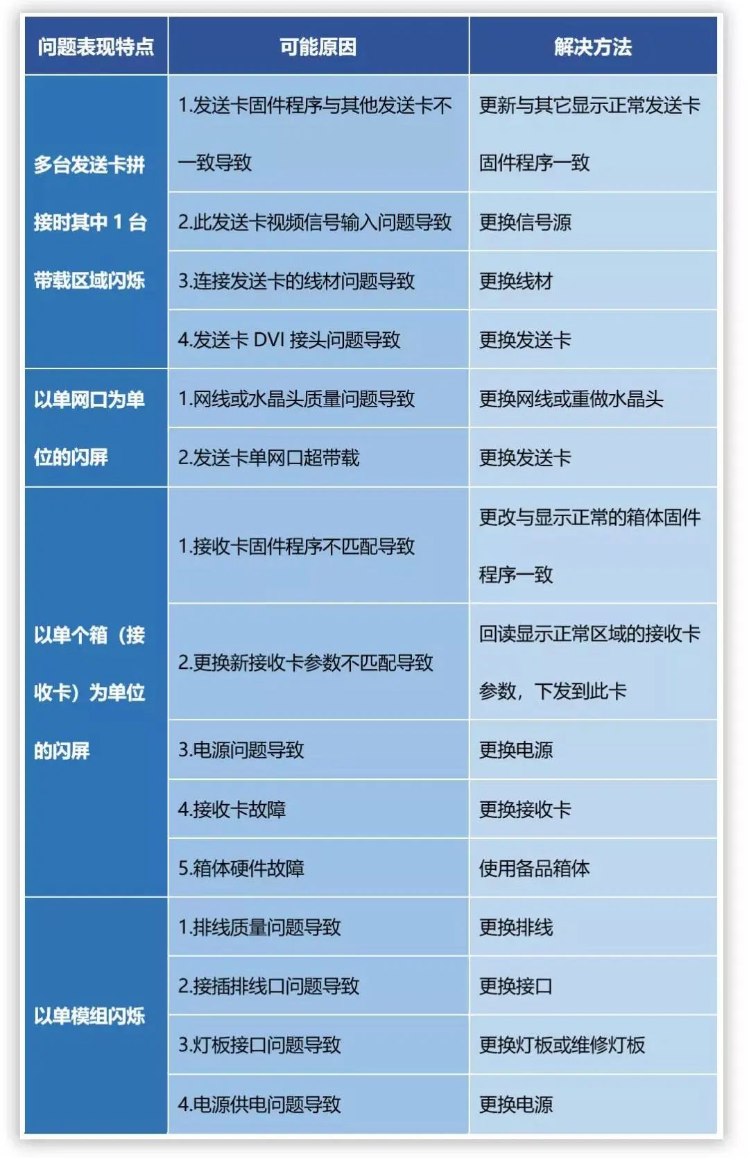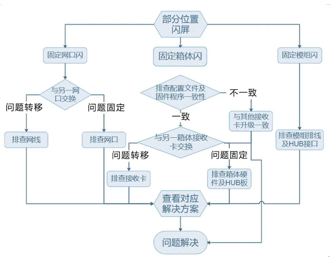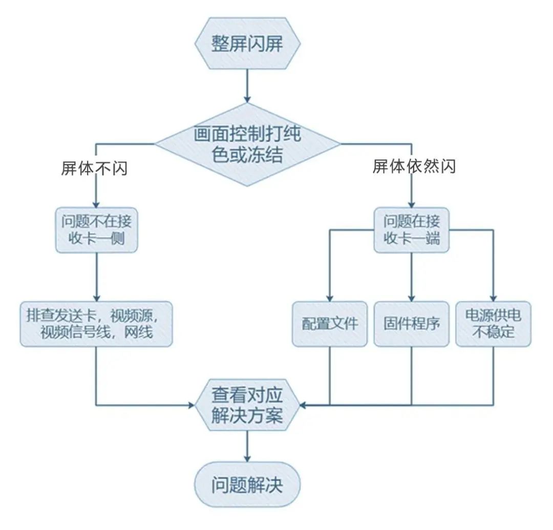 故障分析導(dǎo)致黑屏的原因絕大多數(shù)是無(wú)信號(hào)造成的,而閃屏的根本原因是有信號(hào)但不穩(wěn)定,因此,我們將兩者視為孿生問(wèn)題。同樣是從控制系統(tǒng)架構(gòu)出發(fā),我們可以了解到閃屏問(wèn)題與黑屏問(wèn)題類(lèi)似,分整屏閃和部分屏閃。以下我們將分別為大家解析兩者的排查方法。
